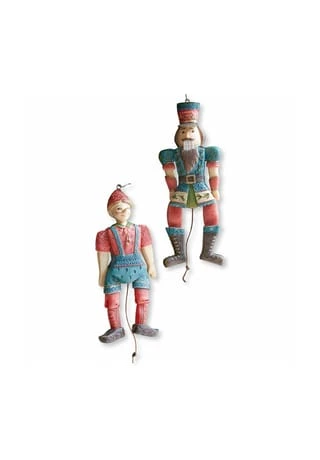 Ganz reizende Nussknacker-Figuren. Handgearbeitet und handbemalt. Niedlicher Hampelmann-Effekt mit Kordel. Diese beiden putzigen Gesellen aus Polyresin machen sofort gute Laune. Sie erinnern an Weihnachten wie in Kindertagen und haben sehr viel nostalgischen Charme. Sie könnten sie an der Wand oder am Fenster aufhängen und sich an ihrer fröhlichen Optik erfreuen. Dank der feinen Gelenke sind die Figürchen beweglich, was sie noch lebendiger wirken lässt. Hiermit setzen Sie einen feierlichen Akzent, vielleicht zum Shabby-Chic. Das freundliche Duo kann Sie jedes Jahr wieder zu den Festtagen begleiten.