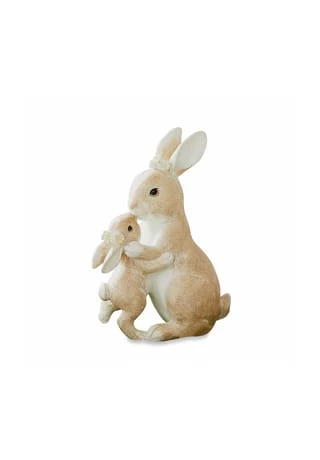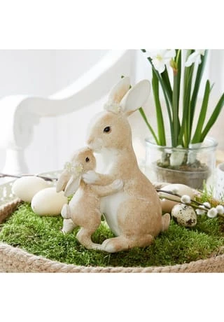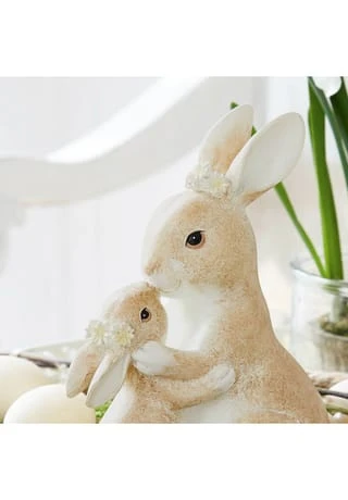 Handbemalt und veredelt. Rührend niedliches Motiv. Stimmungsvoller Osterschmuck aus Polyresin. Mama und Baby Hase sind wirklich herzallerliebst. Sie kuscheln fröhlich und haben sich zu Ostern mit Blüten geschmückt – ein Anblick, der das Herz aufgehen lässt. Platzieren Sie diese Figuren vielleicht auf dem Tisch oder der Fensterbank und gruppieren Sie Blumentöpfe oder gefärbte Eier dazu, um besonders schöne Feiertage zu erleben. Das niedliche Duo passt sehr gut zum Shabby-Chic und ist detailreich gestaltet.