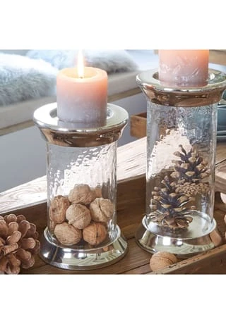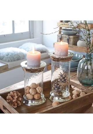 Elegantes Duo für individuelle Dekoration. Die Glaskörper können nach Belieben befüllt werden. Auf dem glänzenden Aluminiumteller nehmen Teelichter oder Stumpenkerzen Platz. Es geht einfach nichts über den romantischen Schein von Kerzenlicht. Mit diesem Set schaffen Sie das perfekte Ambiente für jede Gelegenheit. Das transparente, ungetönte Glas ist ideal, um es mit allerhand Deko wie etwa Blüten, Perlen, Tannenzapfen und ähnliches zu befüllen. Auf den hübschen Glaskörper wird dann ein glänzender Abschluss abgelegt, der Platz bietet für Teelichter oder Stumpenkerzen. Was dieses hochwertige Set ebenfalls auszeichnet, ist die zeitlose Eleganz des Designs. Es fügt sich perfekt in die unterschiedlichsten Interieurs ein.