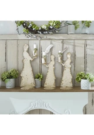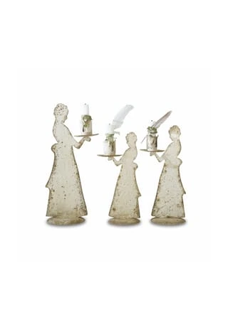 Stilvolles Shabby Chic-Trio. Aus Eisen mit Antik-Finish. Mit festem Sitz für Stabkerzen. Ist die Form dieser bezaubernden Kerzenständer der Silhouette einer Dame des 19. Jahrhunderts nachempfunden oder sind es die Umrisse einer Dienstmagd aus der Barockzeit? Sie sehen also: Das charmante Design ist nicht nur besonders stilvoll, sondern auch ein ausgezeichneter Konversationsstarter. Die unterschiedlich dimensionierten Kerzenständer sind aus hochwertigem Eisen gefertigt und mit einem aufwendigen Antik-Finish veredelt. Das ist quasi Shabby-Chic in Perfektion. Das Trio verleiht jedem Raum ein romantisches Vintage-Flair und auch einzeln platziert sind die Kerzenständer ein charmanter Blickfang.