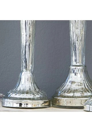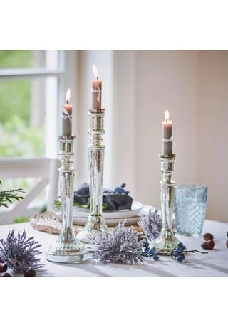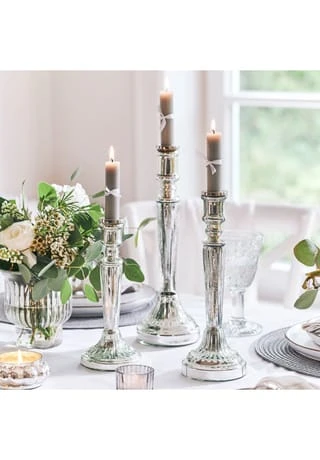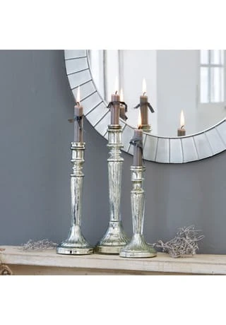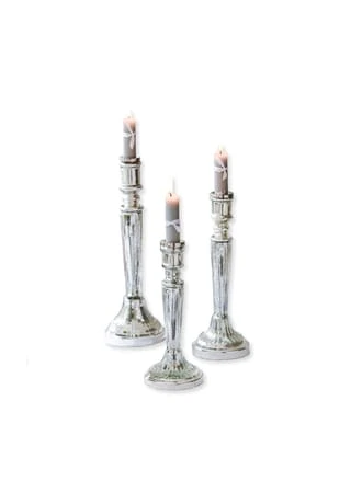 Aus Glas mit Antik-Finish. Das Set besteht aus drei Kerzenständern unterschiedlicher GrĂśĂe. Das klassische Design der gläsernen Leuchter wird von einem edlen Finish in Antiksilber unterstrichen. FĂźr Stabkerzen geeignet, fungieren die drei als festlicher Tafelschmuck oder Hingucker auf der Konsole, Kommode oder dem Fensterbrett.