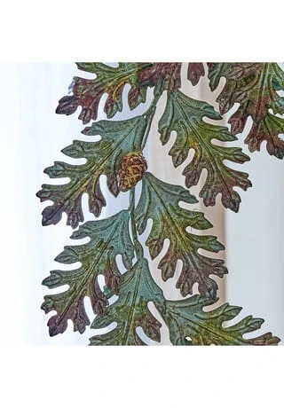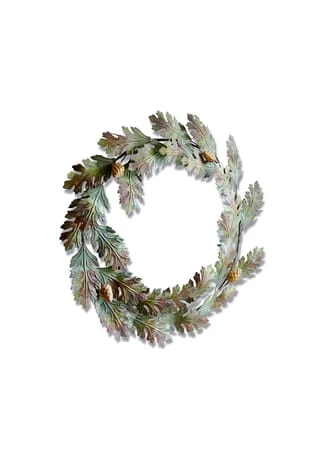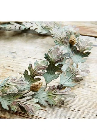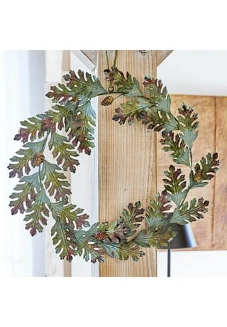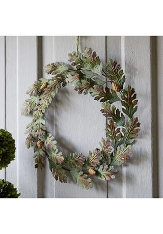 Detailverliebtes Design aus Eisen. Ein aufwendiges Antik-Finish sorgt für herbstliche Farb-Akzente. Naturnahe Gestaltung im Stil von Eichenblättern. Das feine Antik-Finish erinnert optisch an sich langsam färbende Blätter – sehr stimmungsvoll im Herbst. Dazu sorgt es für eine schöne Patina. Der hübsche Deko-Kranz lässt sich vielseitig arrangieren – vielleicht an einem Band aufgehängt, beispielsweise an der Tür oder im Fenster. Auch auf den Tisch gelegt oder an einem Wandhaken befestigt macht er eine sehr gute Figur. Das stilvolle Accessoire sieht in jeder Saison attraktiv aus und schmeichelt zum Beispiel dem Landhaus-Stil. An dem langlebigen und kunstvollen Design können Sie sich viele Jahre erfreuen.