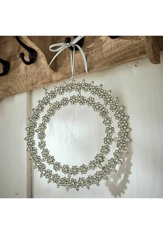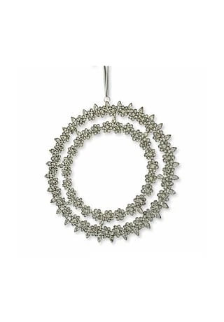 Luxuriöser Kranz. Mit vielen funkelnden Glasperlen besetzt. Aufgehängt oder gelegt eine Zierde. Dieses luxuriöse Accessoire funktioniert nicht nur als Kranz, den Sie auf einer Kommode, dem Fenstersims oder als Tischdekoration platzieren. Auch als Wand- oder Türschmuck macht das funkelnde Kunstwerk eine tolle Figur. Es ist aus Eisen sowie Glas gefertigt und wirkt beinahe wie eine geometrische Skulptur. Die feinen Glasperlen sorgen für eine visuelle Tiefe, die sich durch Kerzen- oder Kunstlicht noch intensivieren lässt. Mit dem mitgelieferten Befestigungsband können Sie den Kranz überall kinderleicht anbringen, um Ihrem Zuhause elegantes Flair zu verleihen.