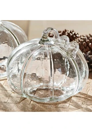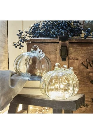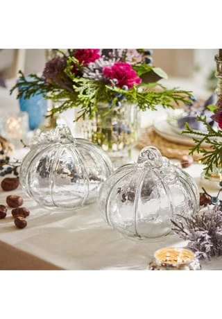 Sehr elegante Kürbis-Dekoration. Mundgeblasenes, klares Glas mit reizvoller Struktur. Klassisches Doppel. Wer den Herbst und die Kürbis-Saison mag, wird diese beiden gläsernen Schmuckstücke lieben. Die Form ist ganz realistisch echten Kürbissen nachempfunden. Die bewusst nicht ganz glatte Oberfläche des Glases gibt ihnen einen leicht rustikalen Charakter. Das elegante Duo ist perfekt, wenn Sie Ihre Herbst-Dekoration ganz zeitlos und edel halten wollen – hiermit genießen Sie die typische Kürbis-Optik ohne starke Farbtöne. So harmoniert das schöne Doppel auch mit wirklich jedem Interieur. Es ist jede Saison wieder eine Freude und lässt sich vielseitig dekorieren.