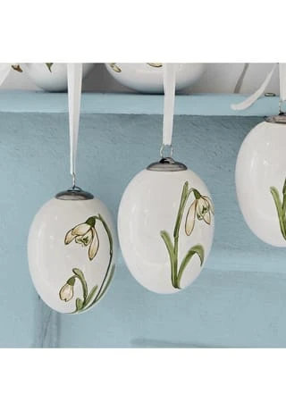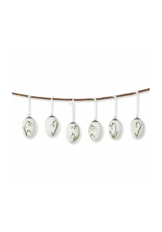 Kunstvoller Schneeglöckchen-Print. Feines Porzellan. Schön wie aus Großmutters Zeiten. Das reizende Set aus sechs Deko-Ostereiern entführt uns gedanklich in frühere Zeiten. Es erinnert an Erbstücke aus längst vergangenen Tagen und passt perfekt zum Shabby-Chic. Jedes Ei ist bereits mit einem passenden Band versehen, sodass Sie gleich mit der Dekoration anfangen können. Das zeitlose, florale Motiv ziert nicht nur zum Osterfest Ihr Heim – wer mag, kann sich ganzjährig daran erfreuen. Grüne Zweige, Wandhaken und mehr freuen sich auf diesen stimmungsvollen Schmuck im Vintage-Look.