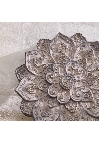 Handgearbeitete Mandala-Kunst. Detailverliebte Ornamentik. Die wunderschönen Muster und Raffinessen werden durch das handgemalte Finish noch unterstrichen. Als Mandala bezeichnet man ein kunstvolles geometrisches Muster, das im Hinduismus und Buddhismus eine magische oder religiöse Bedeutung besitzt. Es ist meist quadratisch oder kreisrund und stets auf das Zentrum fixiert. Dementsprechend wurde auch dieses bezaubernde Wandornament geformt. Verschwenderische Details und Raffinessen unterstreichen den hochwertigen Charakter dieses handgearbeiteten Wandschmucks. Dass es von Hand bemalt wurde, erkennt man bereits auf den ersten Blick.
