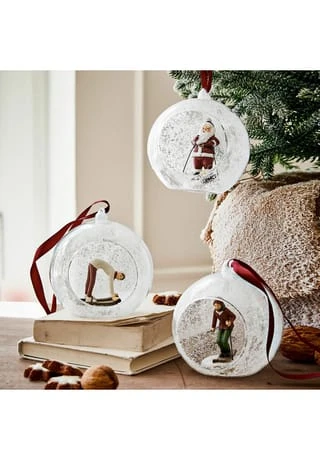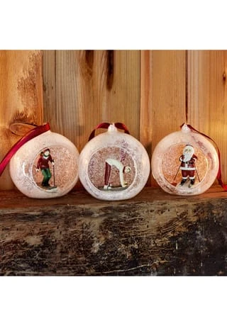 Liebevoll designte Glaskugeln im winterlichen Look, innen mit Schnee-Finish. Fein gestaltete Figuren. Aufhängeband ist inklusive. Geht es noch origineller und schöner? Wohl kaum, denn dieser weihnachtliche Schmuck im Dreier-Set wird kreative Glanzpunkte in Ihrer Dekoration für das Fest der Feste zaubern. Zu schön anzusehen sind die kleinen Figuren auf Ihren Skiern in den Glaskugeln mit dem feinen Schnee-Finish. Bei Groß und Klein werden sie für Begeisterung und neugierige Blicke sorgen. So kann Weihnachten kommen!