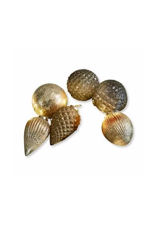 Glas-Designs mit Vintage-Flair. Abwechslungsreiche Strukturen mit teils aufwendigen Finishes. Harmonisches Set. Das nostalgische Set mit verzierter Kappe schmückt harmonisch den Baum oder winterliche Zweige. Es bringt den Charme von früher mit sich und erinnert an die gute, alte Zeit – wunderbar zum Shabby-Chic. Die sechs kunstvoll gearbeiteten Schmuckstückchen machen alle Jahre wieder eine gute Figur und das Fest zur stimmungsvollsten Zeit des Jahres. Genießen Sie es mit diesem tollen Set – ob am Weihnachtsbaum, einer Girlande oder gelegt in einer Schale. An den Messing-Kappen können Sie selbst ein Band anbringen, vielleicht aus Jute, und können die Glaskörper so an jeder beliebigen Stelle anbringen.