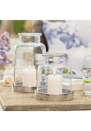 Zeitlose Eleganz in zwei Größen. Unten geöffnet zum einfachen Bestücken mit Kerzen. Aus klarem Glas und schimmerndem Aluminium. Romantischer Kerzenschein und ein Design, das wirklich jedem Ambiente schmeichelt. Die Dämmerung bricht herein, und Sie entzünden darin Kerzen – sofort wird der Moment eine Spur heimeliger und gemütlicher. Gute Gespräche mit Freunden oder ein Buch bei Kerzenlicht lesen, so verzaubern Sie ganz einfach den Abend. Das klare Design macht Ihnen lange Freude und lässt sich zu jedem Ambiente kombinieren. Ob Shabby-Chic, Landhaus oder Industrial-Stil, dieses attraktive Doppel ist zu jeder Jahreszeit und drinnen wie draußen ein Gewinn.
