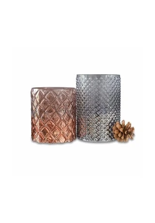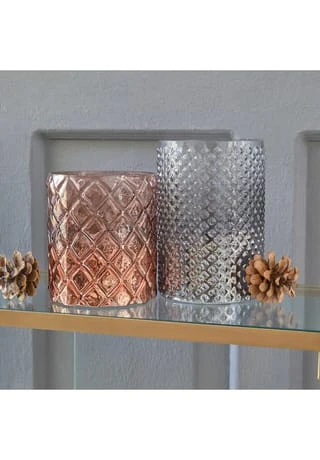 Aus reinem Glas mit besonderen Rautenprägungen. Zwei unterschiedliche Designs im Set. Unterschiedliche Tönungen sorgen für Kontrast und gleichzeitig für Harmonie. Dieses Set punktet mit zeitloser Eleganz und raffinierten Details. Es besteht aus zwei Windlichtern, die sich in ihrer Größe und Musterprägung des Glases unterscheiden. Das Rautenmuster reflektiert und bricht das Kerzenlicht auf besonders attraktive Weise. Selbstverständlich können Sie die gläsernen Schmuckstücke auch mit Deko-Material, frischen Schnittblumen oder getrockneten Pflanzen befüllen. Auch als Einweihungsgeschenk ist dieses elegante Duo sehr gefragt.