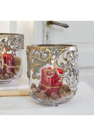 Romantisches Set aus Glas. Filigrane, florale Verzierungen aus Stahl, die auch abnehmbar sind. Mediterran inspiriert. Holen Sie die Schönheit vergangener Zeiten und goldenen Kerzenschein in einem zu sich. Das reich geschmückte und wunderhübsche Duo aus Glas ist der perfekte Begleiter hierfür. Stellen Sie einfach Teelichter ein und erfreuen Sie sich am Spiel von Licht und Schatten. Das reizvolle Design passt hervorragend zum Shabby-Chic und verschönert jede Saison. Wer möchte, könnte auch kleine Dinge in den edlen Windlichtern aufbewahren oder sie mit Mini-Zweigen und Blüten bestücken.