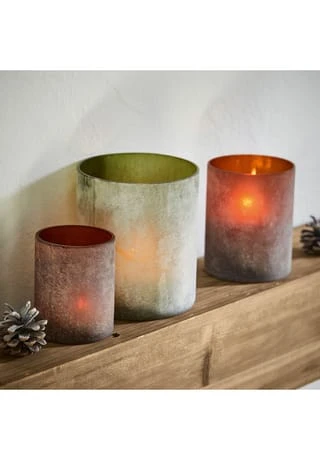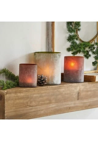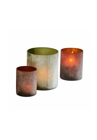 Farblich perfekt kombiniertes Trio. Aus getöntem Glas mit kunstvoll beschichteter Oberfläche. Drei verschiedene Größen im Set. Diese Windlichter sind perfekt für jeden Raum und bereichern ihn mit einem Hauch von Eleganz sowie Raffinesse. Das getönte Glas verleiht dem Kerzenlicht einen subtilen und warmen Touch. Die schönen Farbtöne kommen so besonders schön zur Geltung und dasselbe gilt für den einzigartigen Charakter der rauen Oberfläche. Diese ist zusätzlich mit einer feinen Beschichtung veredelt, die dem Material einen authentischen Vintage-Look verleiht. Langer Rede, kurzer Sinn: Dieses stilvolle Trio verströmt sowohl bei einem romantischen Abendessen als auch beim entspannenden Vollbad eine herrliche Wohlfühlatmosphäre. Das Set lässt sich mit handelsüblichen Teelichtern bestücken, die nicht mitgeliefert werden.