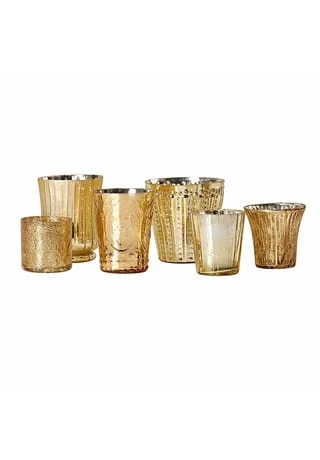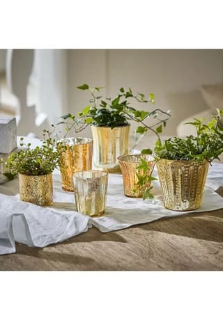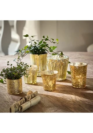 Romantischer Look mit nostalgischem Flair. Feines Glas mit schimmerndem Bauernsilber-Finish. Sechs reizende Designs im Set. Wer den Shabby-Chic mag, wird dieses bezaubernde Set lieben. Die sechs wunderhübschen Designs haben das Flair früherer Zeiten und zaubern eine sehr gemütliche Lichtstimmung in Ihr Heim. Sie können sie einzeln oder alle zusammen platzieren und so ein Schaumbad, das Frühstück am Wochenende oder einen guten Film abends auf der Couch gleich noch mehr genießen. Als Alternative können die verzierten, gläsernen Accessoires auch als Vasen oder zur Aufbewahrung für Stifte oder kleine Gegenstände genutzt werden – echte Multitalente mit viel Vintage-Charakter.